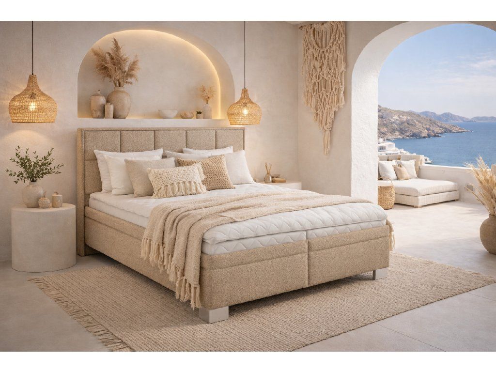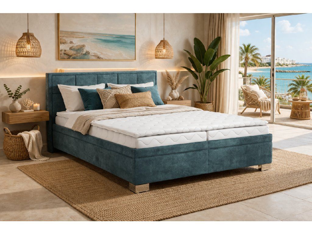 Luxusní, kontinentální postel Larnaca od českého výrobce MAWS , jejíž plocha je tvořena ze dvou vrstev - první vrstva je pružinové jádro typu Bonell, na které je uloženo k lamelovému masivnímu rámu. Součástí postele je velký úložný prostor s přístupem z boku postele.
