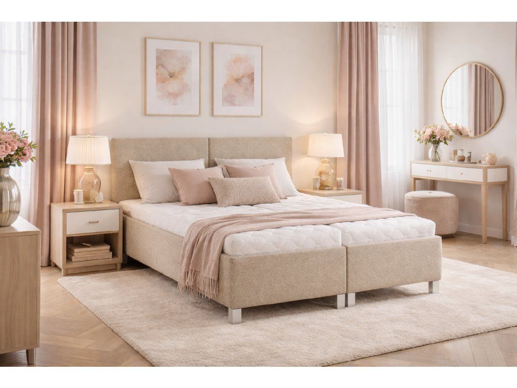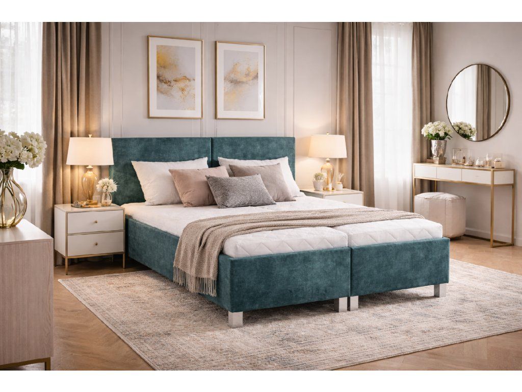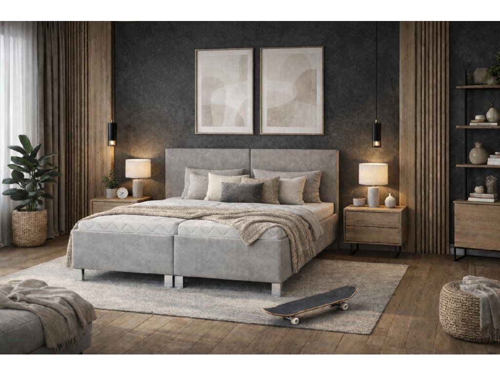 Manželská čalouněná postel Vario Double, která se dá snadno přenastavit na 2 samostatné válendy. Kdy při rozdělení doporučujeme každou válendu dát k protější stěně. Viz. obrázek. Postel je včetně volně ložených matrací od českého výrobce MAWS s kvalitním polohovacím, lamelovým roštem a úložným prostorem.